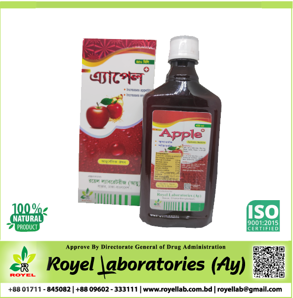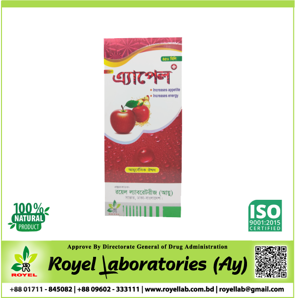 রয়েল এ্যপেল প্লাস (এলাদ্যরিষ্ট) আয়ুর্বেদিক ঔষধ, উৎপাদনঃ প্রতি ৫ মি.লি. নির্যাসে রয়েছে । বড় এলাচ....০.৩৭ গ্রাম. বাসক....০.১৫ গ্রাম. মন্জিষ্ঠা.....৭৪.৯৪ মি.গ্রা. কুটজত্বক....৭৪.৯৪ মি.গ্রা. ও অন্যান্য সহযোগী উপাদান । সূত্রঃ (এলাদ্যরিষ্ট) বাংলাদেশ জাতীয় আয়ুর্বেদিক ফর্মুলারী । কার্যকারীতাঃ বিসর্প, মসুরিকা,শীতপিত্ত,বিষমজ্বর,দৃষিতকাস, সুদারুন শ্বাস,ভগন্দর, ফিরঙ্গ,রোমান্তিকা, বিষমেহ,প্রমেহপিড়কা ও রক্তদুষ্টি প্রশমক। সেবন মাত্রাঃ প্রত্যেহ সকালে ও রাতে আহারের পর ১-২ চা চামচ ঔষধ, সমপরিমান পানি মিশিয়ে সেব্য অথবা চিকিৎসকের পরামর্শে সেব্য । সতর্কতা :